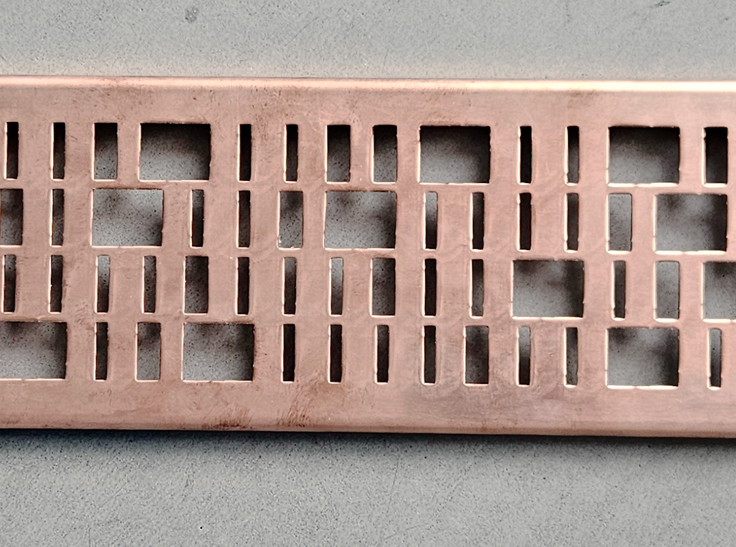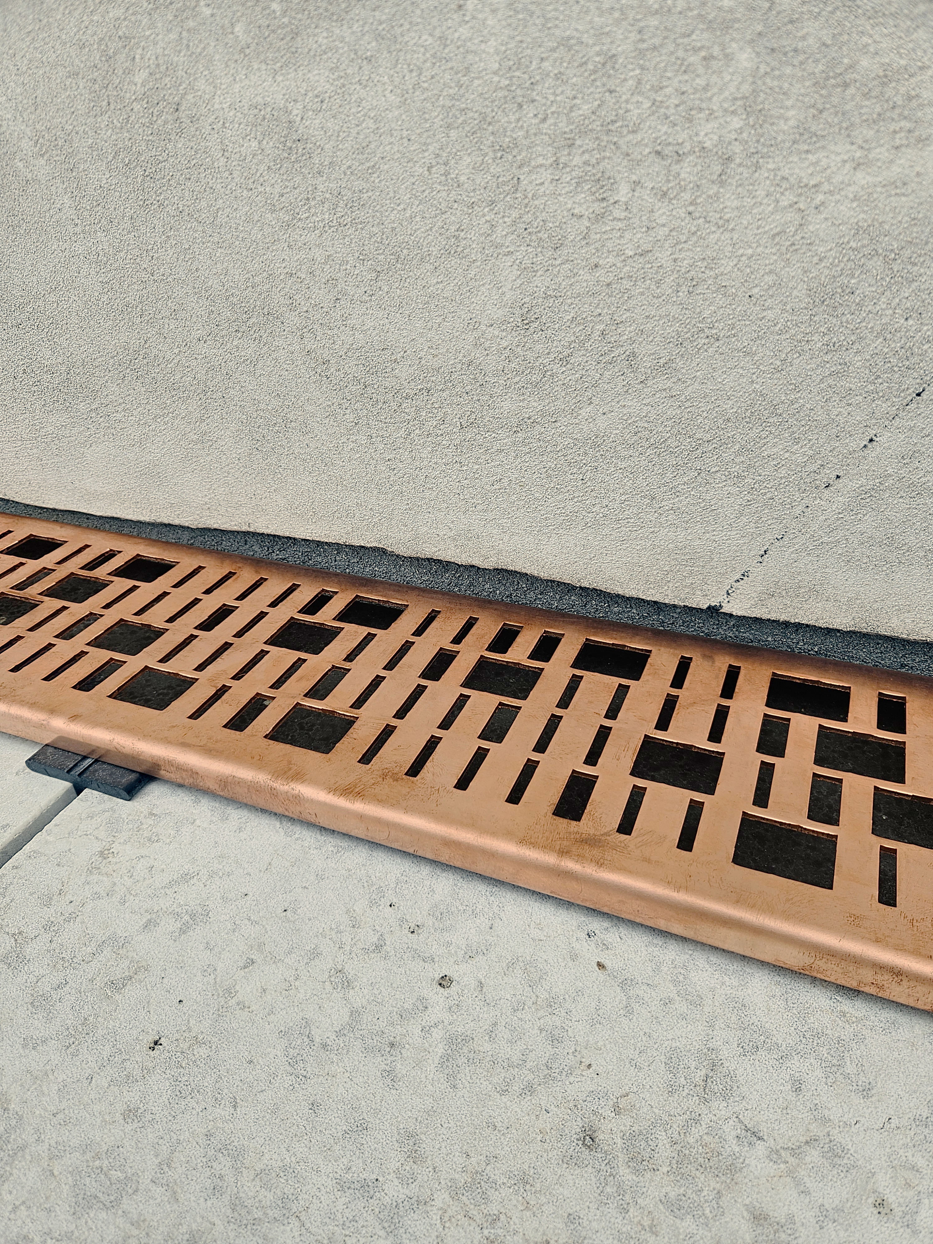 Kobberristene er designet med fokus på holdbarhed, funktion og materialekvalitet. Over tid udvikler kobberet en naturlig patina, som tilfører dybde og karakter og forankrer detaljen i projektets samlede materialepalet. Perforeringsmønstret er nøje afstemt for at sikre effektiv afvanding, samtidig med at det skaber en rytmisk overflade, der relaterer sig til den omkringliggende arkitekturs skala og geometri. Som landskabsarkitektonisk detalje viser ristene, hvordan tekniske elementer kan løftes ud over deres rent funktionelle rolle. Frem for at blive skjult bliver afvandingen et synligt og integreret element i den arkitektoniske og rumlige oplevelse – hvor nødvendighed omsættes til et gennemtænkt designgreb.